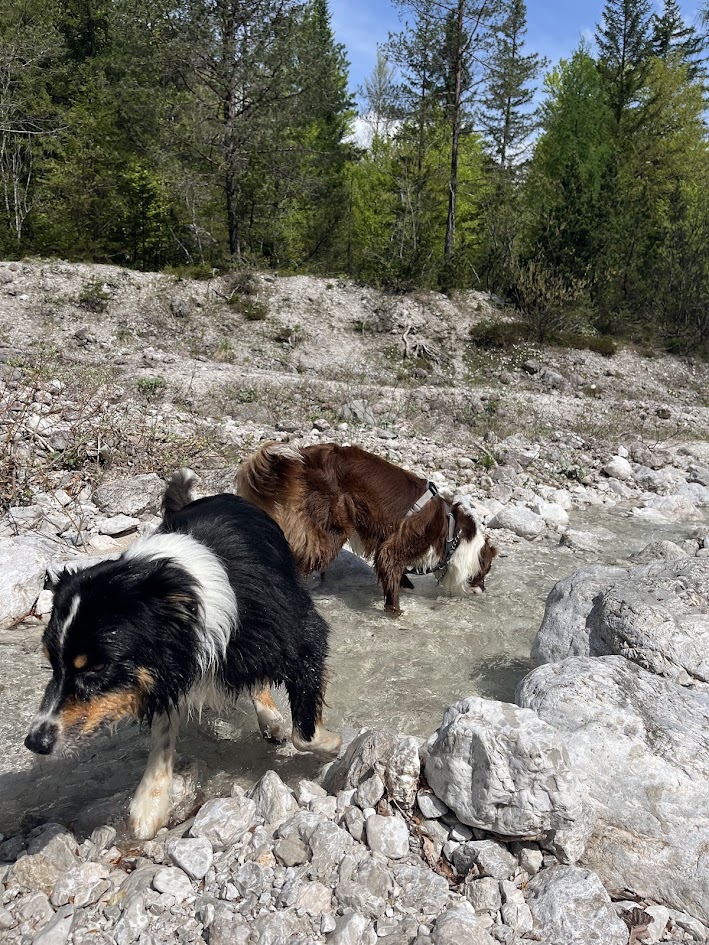 Biggie je velik ljubitelj vode in bil je presrečen, saj je ob poti ves čas tekel potok. Veselo je čofotal, raziskoval in se vmes celo “potapljal” za kamni. Na poti nazaj v Planico je izvedel pravi mali potapljaški tečaj, ko je v vodi iskal izgubljen kamen – s popolnim navdušenjem.