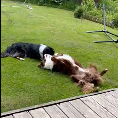 Včeraj smo imeli kopalni dan, danes pa še dan za česanje. Oba sta zdaj svileno mehka – vsaj do prve luže ali skoka v vodo. Čez dan sta bila z nami na vrtu. Kobi je dobil kost, Biggie pa svojo že prej pojedel.