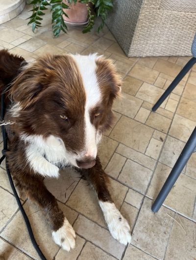 Zjutraj sem ga peljala na dolg sprehod. Potem sva se pridružila Kobiju in Juretu v lokalni kafetariji – prvi poskus kave. Biggie se je lepo ulegel, vse je bilo mirno. Prvi vtis – super. Na sliki je sproščen pes pod mizo, leži in nič ga ne zanima.