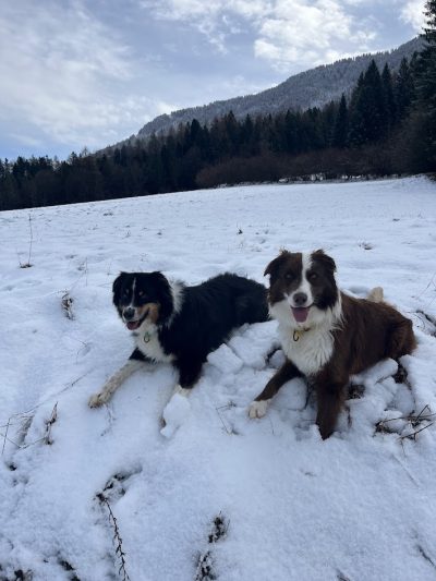 Na sprehodu sta zdaj vsak posebej dokaj normalno vodljiva, na povodcu ne vlečeta in hodita lepo ob meni – ne povsem ob nogi, ampak vsaj ne vlečeta vrvice. Biggie je pri tem veliko bolj priden. Kobi še vedno občasno potegne, zato je naš letošnji zimski izziv najprej učenje lepe hoje na povodcu – vsak posebej – in potem še skupno učenje.